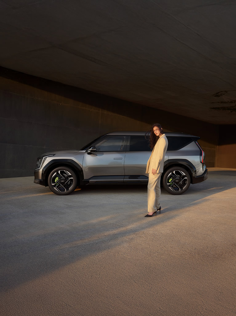 Der EV9 GT überzeugt aus jedem Blickwinkel: Schwarze Dachreling, glänzend schwarze Fensterleisten und Spiegelgehäuse betonen die dynamische Silhouette. Technisch geformte Seitenschweller und ein trapezförmiger Heckstoßfänger mit sportlichem Unterfahrschutz runden das Design ab.